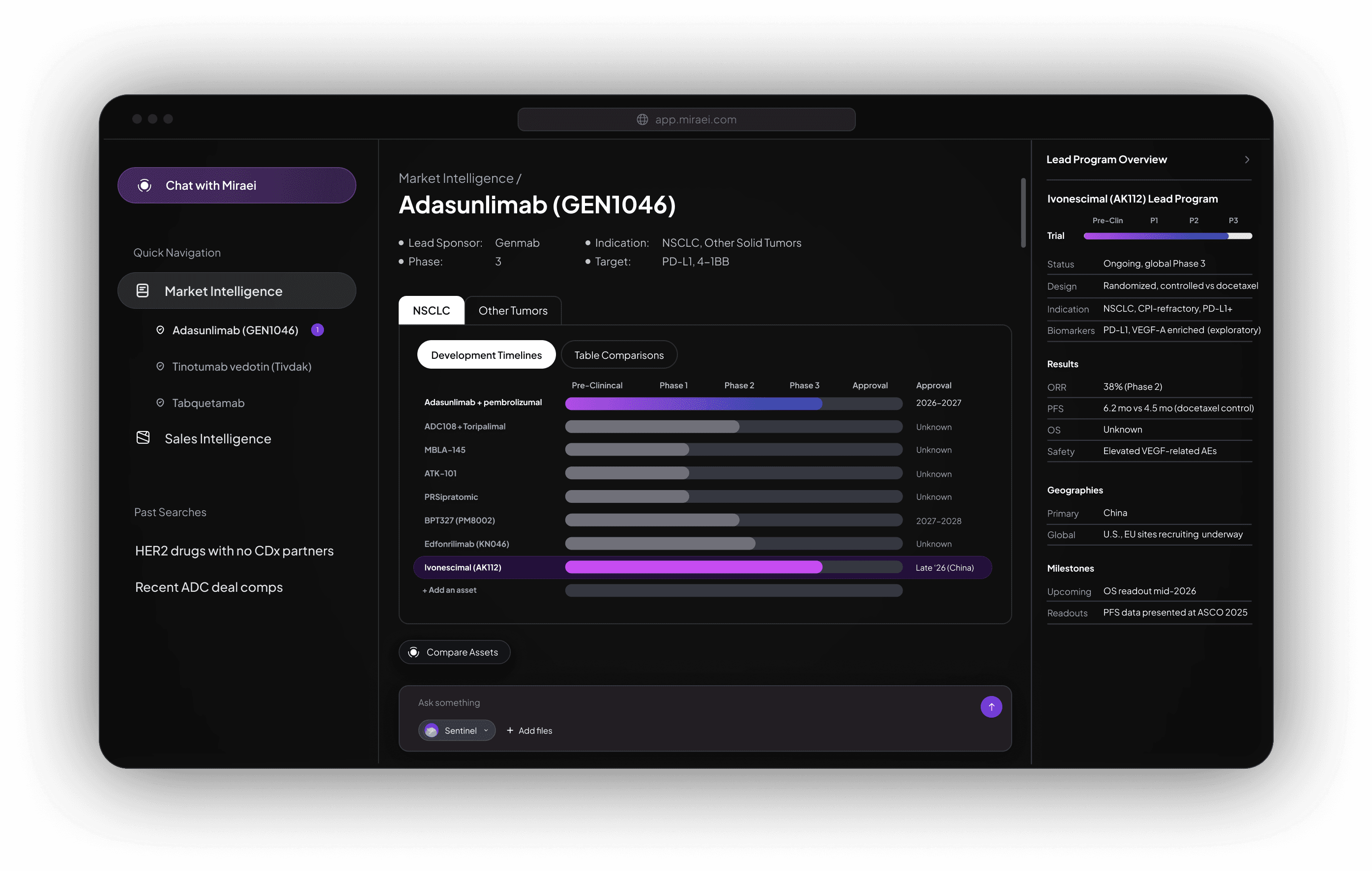 Always on. Always available. Miraei is constantly scanning the market and flagging important events to help answer the questions that keep strategy teams up at night.